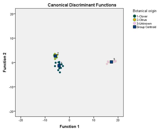 In Figure 1 it is also shown that clover, citrus, and unknown honeys are well differentiated. The overall correct classification rate was 100% for the original and 92.9% for the cross validation method, which is considered a very satisfactory discrimination rate for this method. The higher discrimination rate was provided for citrus (100%) followed by clover (93.3%), and unknown (83.3%) honeys. Table 6 lists the discriminatory power of the developed statistical model.