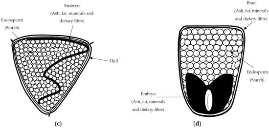 Figure 1. Schematic representation of grain structure of quinoa and amaranth (a); rice (b); buckwheat (c); and maize (d).