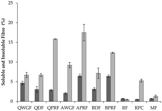 Dietary fibre denotes carbohydrate polymers which are not hydrolysed by the endogenous enzymes in the small intestine of humans [21,22]. Total dietary fibre (TDF) is divided into two categories, based on differences in solubility in water: soluble (SDF) and insoluble (IDF) dietary fibre. Protein-rich cereal ingredients showed significantly higher levels (19–24%) (p < 0.05) of TDF than the regular protein containing ingredients (1.1–11.5%) (Table 1 and Figure 2). Among the pseudocereal flours there were no significant differences (p < 0.05) in TDF, but they showed higher contents of TDF (p < 0.05) in comparison with RF and MF. These results were expected on comparison with literature data: Nascimento et al. [33], reported that pseudocereals can have seven times more fibre than common grains such as rice. The TDF values were similar to those found in other studies for quinoa [33,44,45] where values for TDF of 10.4%, 11.7%, and 12.7%, respectively, were reported, whereas Alvarez-Jubete et al. [26] reported slightly higher values for TDF (14.2%). The value for AWGF is in line with Nascimento et al. [33] who reported a TDF content of 11.3% for amaranth. Other authors, such as Repo-Carrasco et al. [46], reported slightly higher values (ranging from 14% to 16%) for amaranth (Amaranthus caudatus) flours. Regarding the soluble and insoluble dietary fibre fractions, the IDF fraction was higher than the SDF fraction in all the ingredients except for RF. This is in accordance with values reported in the literature for quinoa [47,48] and amaranth [19]. However, the IDF content of AWGF was slightly lower than that reported previously by Repo-Carrasco et al. [46] for the varieties Oscar Blanco (12.15%) and Centenario (13.92%). RPC had the lowest values for TDF, SDF, and IDF, which might be explained by the higher protein enrichment levels for this sample, which was in turn, associated with lower levels of other components such as starch, fat, and dietary fibre.