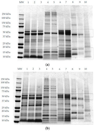 The protein profile was assessed by sodium dodecyl sulphate-polyacrylamide gel electrophoresis (SDS-PAGE) using precast gels (Mini-PROTEAN TGX, Bio-Rad Laboratories, Hercules, CA, USA) under non-reducing (method I and II) and reducing conditions (method III). The sample loading buffer contained 65.8 mM Tris-HCl (pH 6.8), 26.3% glycerol, 2.1% sodium dodecyl sulfate (SDS) and 0.01% bromophenol blue. The running buffer (10× Tris/Glycine/SDS, Bio-Rad Laboratories, Hercules, CA, USA) had a composition of 25 mM Tris, 192 mM glycine, and 0.1% SDS (w/v), pH 8.3. The staining solution used was Coomassie Brilliant Blue R-250 (Bio-Rad Laboratories, Hercules, CA, USA). The target final protein concentration was, in all cases, 1 mg/mL, and 10 µL of sample solution loaded into each well of the gel. For the preparation of the samples, three different methods were used. For method I, the approach of Abugoch et al. [34] was followed, with slight modifications. Briefly, the powder samples were mixed directly with the sample loading buffer at a concentration of 1 mg/mL, vortexed for 1 min until the powder was fully suspended and mixed over 2 h at 20 °C and at 250 rpm. For methods II and III, the approach of Amagliani et al. [20] was followed, with the modification that the powders were mixed with the protein extracting buffer overnight, and 1,4-dithiothreitol (DTT; 1%) was used in method III as a reducing agent.