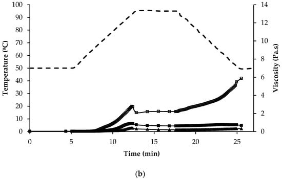 Figure 5. Temperature (dashed line) and viscosity (symbols) at various stages of the pasting regime of (a) regular protein containing flours: quinoa wholegrain flour ( Foods 07 00073 i003), quinoa dehulled flour ( Foods 07 00073 i004), amaranth wholegrain flour ( Foods 07 00073 i005), buckwheat dehulled flour (BDF) ( Foods 07 00073 i006), rice flour (RF) ( Foods 07 00073 i007), and maize flour ( Foods 07 00073 i008); (b) of protein enriched flour ingredients: quinoa protein-rich flour ( Foods 07 00073 i003), amaranth protein-rich flour ( Foods 07 00073 i005), buckwheat protein-rich flour ( Foods 07 00073 i006).