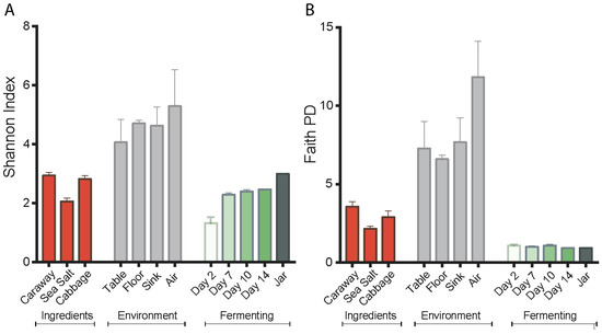 Alpha diversity measures of the sauerkraut, ingredient, and environment samples. (A) Shannon index; and (B) Faith’s phylogenetic diversity (PD). Error bars represent standard error of the mean.