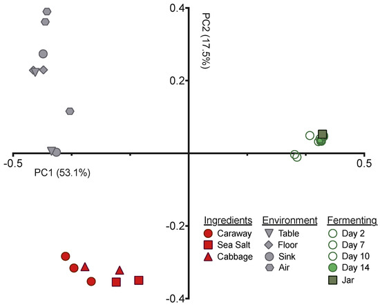 PCoA depicting the unweighted UniFrac distance between fermenting sauerkraut, environment, and ingredient microbiome samples.