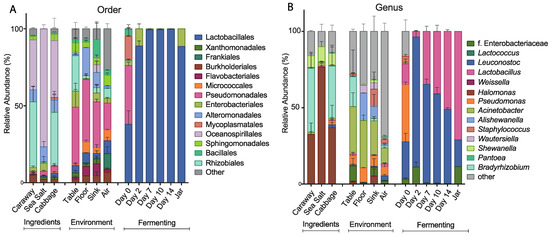 Relative abundance of bacterial taxa in the fermenting sauerkraut, ingredient, and environmental samples at the (A) order and (B) genus levels. Only the top seven taxa from the fermenting and ingredients/environment sample groupings are shown.