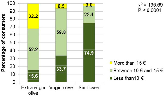 The process of perception of quality by consumers consists of two phases: the first is based on the perception of extrinsic and intrinsic attributes formed at the point of purchase, and the second is based on the experience formed during the preparation and consumption of the product [28,29]. This is when the expectations formed during the purchase are confirmed or rejected. These two stages are less important when a product is unknown (as may be the case of lamb confit because only a small part of the sample knew of it) or when the consumer does not know whether he or she has tasted it. In this case, the willingness to pay and even the decision to purchase the unknown product are probably based largely on the type of consumer. Thus, an “adventurous” consumer may pay more to try a product that he or she does not know, unlike more conservative or traditional consumers. However, in the scope of this work, there was no differential behavior between groups of consumers for willingness to pay for lamb confit. On the other hand, when the consumer is given information about the quality of the oil used in cooking, which is also a known product, perception of quality and price are positively related [27]. Moreover, although lamb confit is not a known product, olive oil is a well-known and traditional Mediterranean product, and prior knowledge of the product is important when buying food [30,31]. In addition, the appreciation of the different oils includes factors that take into account health [28]. The perception of a food as healthy (as is the case of virgin olive oil), natural, organic or respectful of the environment leads to a greater willingness to pay for the product [31,32], as can be clearly seen in the results of this study. However, when the consumer is not willing to pay a certain price, the conclusion is that the product does not have perceived net value [27], which would be the case of lamb confit preserved in sunflower oil, whose price is limited to a maximum of €15.