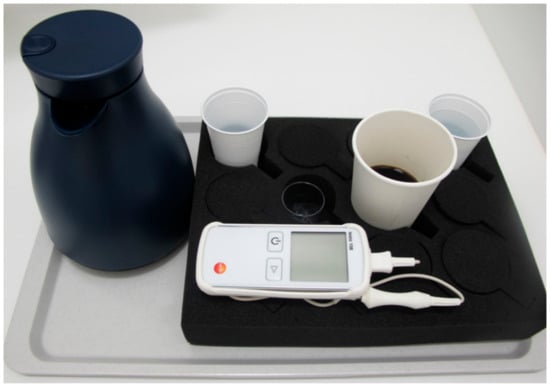The very hot coffee, however, is poured only shortly before the start of the experiment to ensure its high temperature. In order to be able to hinder the rapid cooling of the coffee, tests are carried out with a cup holder made of foam (Florence foam holder for 12 glasses/cups, 330 × 245 × 60 mm, Haba BV, Maasland, The Netherlands). With the help of the foam, the cups are isolated and thus delay the cooling. In order to minimize the cooling of the coffee in the thermos flasks as well, they are preheated before the experiments by adding boiling hot water. The water is removed from the thermos flasks shortly before the test persons arrive. By using a water dispenser (Bunn H3EA Hot Water Dispenser, Bunn, Springfield, IL, USA) for the preparation of the “very hot” coffee, constant temperatures of about 96 °C can be achieved. This coffee is prepared only after the brief introduction of the participants to keep these temperatures as long as possible.