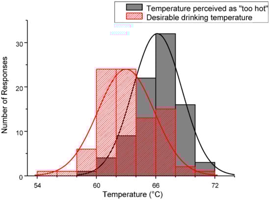 Still, many of the participants in our study perceive coffee temperatures of around 60 °C and also much higher as desirable and certainly not too hot. This discrepancy is explained by Lee et al. [18] by the fact that the temperatures may not be kept in the mouth long enough. A swallowing process lasts only a few seconds, so the temperature exposure acting on the mucous membranes in the mouth and on the tongue is not sufficiently long and thus not able to reach an action potential. Thus, no pain is transmitted despite high temperatures, so that consumers are able to drink the hot drinks without pain.