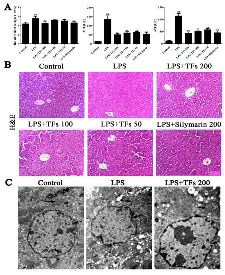 Effects of total flavonoids (TFs) on lipopolysaccharides (LPS)-induced liver injury and cellular structure changes in mice. (A) Effects of TFs on relative liver weight, serum ALT (alanine transferase) and AST (aspartate transaminase) activities. (B) Hematoxylin and Eosin (H&E) staining of liver tissues (200× magnification,). (C) TEM (transmission electron microscope) observations of the nuclei and mitochondria in liver cells (20,000× magnification,). The values are expressed as the mean ± SD (standard deviation) (n = 8); ## p < 0.01 versus control group; ** p < 0.01 versus model group.