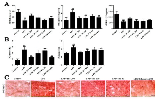 Effects of TFs on LPS-induced oxidative stress and lipid metabolism in mice. (A) Effectsof TFs on SOD (superoxide dismutase), MDA (malondialdehyde), and GSH-Px (glutathione peroxidase) levels in the livers of control mice and mice undergoing different treatments. (B) Effects of TFs on serum TG (total triglyceride) and TC (total cholesterol) levels in mice. (C) Oil Red O staining of liver tissues (200× magnification). The values are expressed as the mean ± SD (n = 8); ## p < 0.01 versus control group; * p < 0.05and ** p < 0.01 versus model group.