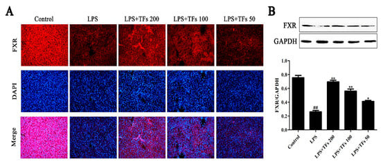 The results of the immunofluorescence staining and western blotting assays are shown in Figure 3A,B. Compared with the control group, the expression level of FXR was markedly decreased by LPS in the model group and was significantly upregulated by TFs. These data indicated that TFs attenuated LPS-induced liver injury by upregulatingt he FXR signal pathway.