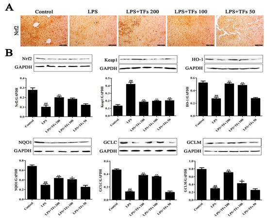 The antioxidant activities of TFs are shown in Figure 2A. The levels of SOD and GSH-Px in livers were significantly reduced, and the MDA level was significantly increased in LPS-treated mice compared with the control group (p < 0.01) and were markedly restored by the TFs.