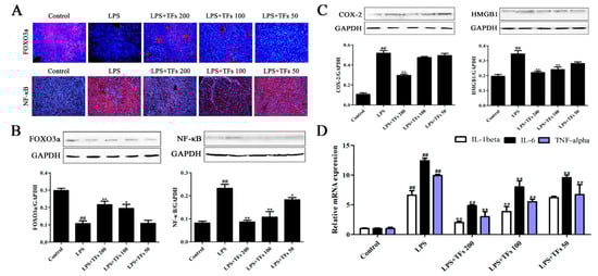 The immunofluorescence staining and western blotting results of FOXO3a and NF-κB are shown in Figure 5A,B. The expression level of FOXO3a in the model group was increased after LPS induction, and this increase was significantly reversed by TFs. Besides, the protein levels of COX-2 and HMGB1 were notably upregulated (Figure 5C), whereas TFs obviously downregulated their expression levels. Furthermore, the gene expression levels of IL-1β, IL-6, and TNF-α (Figure 5D) were upregulated by LPS and were significantly reduced by the extract. These results suggested that TFs attenuated LPS-induced inflammation by regulating the FXR-FOXO3a signal pathway.