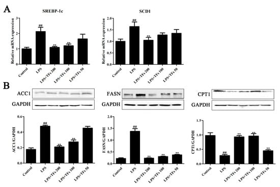 As shown in Figure 6A, TFs administration notably reduced the levels of SREBP-1c and SCD1 compared with the model group (p < 0.01). In Figure 6B, the protein levels of ACC1 and FASN in model mice were obviously upregulated, while the expression level of CPT1 was significantly decreased. TFs administration (200 mg/kg) markedly reversed their expression levels (p < 0.01). These data indicated that TFs regulated LPS-induced lipid metabolism by modulating FXR/SREBP- 1c signaling.