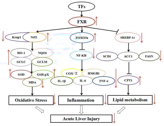 FXR is a member of the nuclear hormone receptor super family, and it was demonstrated that FXR can regulate oxidative stress, inflammation, and lipid metabolism thus improving liver injuries [10,39,40,41]. In our study, TFs exhibited a protective effect against LPS-induced liver injury by enhancing FXR effects on oxidative stress, inflammation, and lipid metabolism (Figure 7).