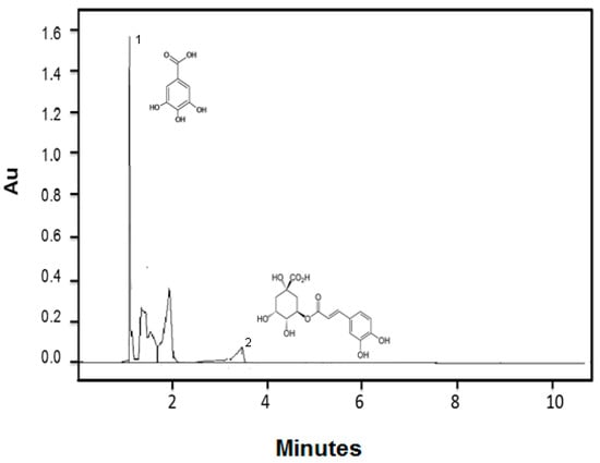 Ultra-high-performance liquid chromatography–diode array detector (UPLC-DAD) chromatogram showing phenolic compounds identified in mango seed extract. 1.Gallic acid. 2.Chlorogenic acid.