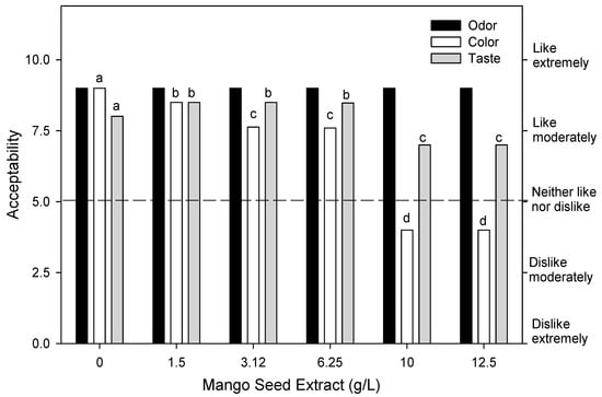 Liking level of odor, color, and taste of fresh-cut mango fruits treated with different mango seed extract concentrations. Different letters in the same parameter evaluated means significant difference (p < 0.05).