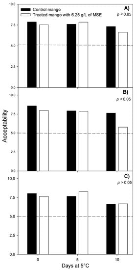 Effect of 6.25 g/L of mango seed extract (MSE) on the acceptability of (A) odor, (B) color and (C) taste of fresh-cut mango stored at 5 °C for 10 days (Scale 10 = like extremely, 7.5 = like moderately, 5 = neither like nor dislike, 2.5 = dislike moderately, 0 = dislike extremely). p < 0.05 means significant difference between control and treatment.