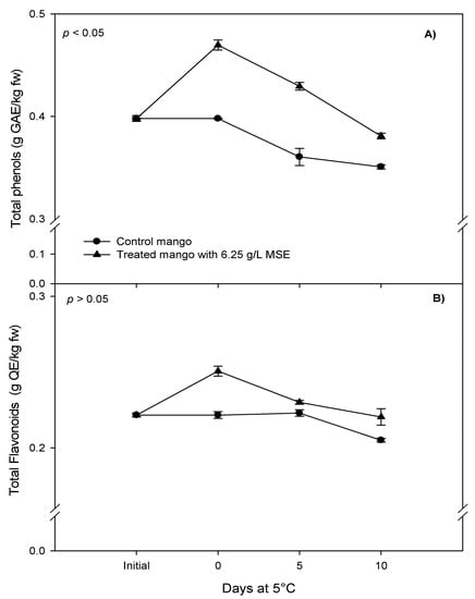 Effect of 6.25 g/L of mango seed extract (MSE) in the total (A) phenol and (B) flavonoid content of fresh-cut mango stored at 5 °C for 10 days. p < 0.05 means significant difference between control and treatment. Means ± standard error.