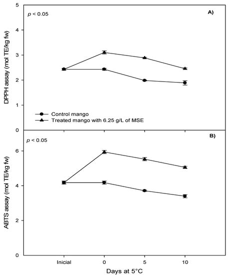 Effect of 6.25 g/L of mango seed extract (MSE) in the antioxidant capacity for the (A) 2,2-diphenyl-1-picryl-hydrazyl DPPH assay and (B) 2,2′-azino-bis(3-ethylbenzothiazoline-6-sulphonic acid) (ABTS) assay of fresh-cut mango stored at 5 °C for 10 days. p < 0.05 means significant difference between control and treatment. Means ± standard error.