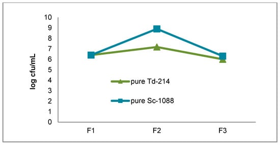 The growth of yeasts during pure culture fermentations. Pure Td-214: pure T. delbrueckii-214, pure Sc-1088: pure S. cerevisiae-1088. F1: beginning of fermentation. F2: middle of fermentation. F3: end of fermentation.