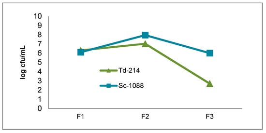 The growth of yeasts during mixed culture fermentation. Td-214: T. delbrueckii-214, Sc-1088: S. cerevisiae-1088. F1: beginning of fermentation. F2: middle of fermentation. F3: end of fermentation.