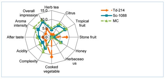 Figure 3 shows the sensory analysis results of Narince wines. Wine fermented with mixed culture of T. delbrueckii-214 and S. cerevisiae-1088 obtained higher scores in herbal tea, citrus, tropical fruit, honey attributes, and followed by the wine fermented with pure S. cerevisiae-1088 culture. The wine fermented with pure T. delbrueckii-214 scored highest in stone fruit and cooked vegetable attributes. The unpleasant cooked vegetable attribute was probably due to higher level production of methionol. The aroma intensity and complexity attributes were greater in mixed culture fermentation compared to pure culture fermentations. This Narince wine, which is fermented with mixed culture, is the most preferred wine compared to others. Gonzales-Rayo et al. [] have reported that Macabeo wine inoculated with a mixed culture of T. delbrueckii and S. cerevisiae was the most preferred wine among the others.