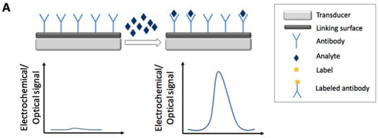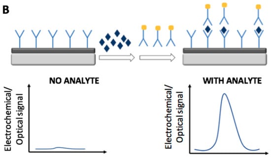 Figure 1 and Figure 2 report the main electrochemical and optical detection strategies used for the recognition/quantification of the analytes by the use of immunosensors: in particular label free non-competitive assay (Figure 1A), labeled non-competitive assay (Figure 1B) and labeled competitive assay (Figure 2).