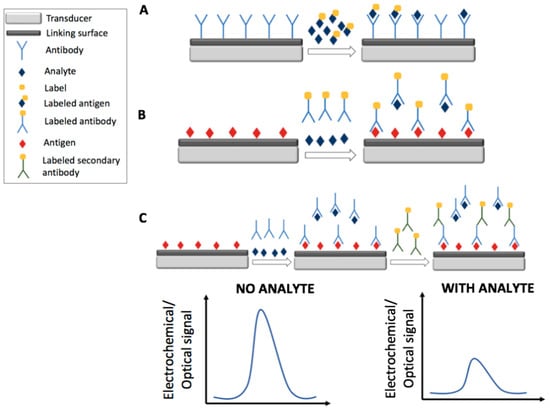 Schematic representation of electrochemical and optical labeled competitive detection strategies by the use of immunosensors: competition for the antibody among the analyte and the labeled antigen (A); competition for the labeled antibody among the analyte and the antigen (B); competition for the antibody among the analyte and the antigen and detection by the use of a labeled secondary antibody (C).