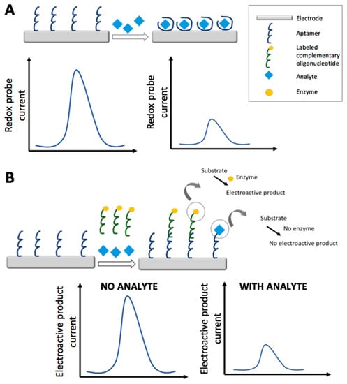 Schematic representation of detection strategies for an electrochemical aptasensor: label free non-competitive detection by the use of a redox probe (A); labeled competitive detection exploiting the signal generated by the electroactive product of the reaction catalyzed by an enzyme (B). The competition for the aptamer is among the analyte and the labeled complementary oligonucleotide; with the increase of the analyte concentration there is a decrease of the labeled complementary oligonucleotide bound to the aptamer and thus of enzyme and consequently a decrease in the electroactive product signal.