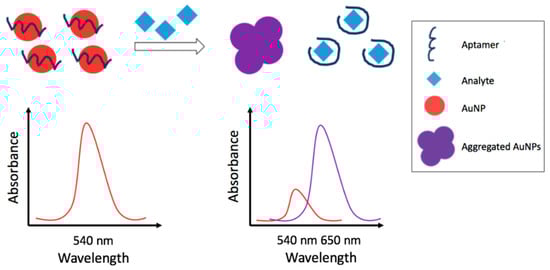 Schematic representation of colorimetric detection strategy employing an aptamer; the strategy is based on the analyte-induced aggregation of AuNPs.