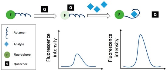 Schematic representation of fluorescence detection strategy employing an aptamer; the strategy is based on the fluorophore fluorescence quenching by the use of a quencher.