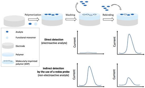 Schematic representation of an electrochemical molecular imprinted polymers (MIP) sensor production and detection of the analyte: direct detection and indirect detection by the use of a redox probe.