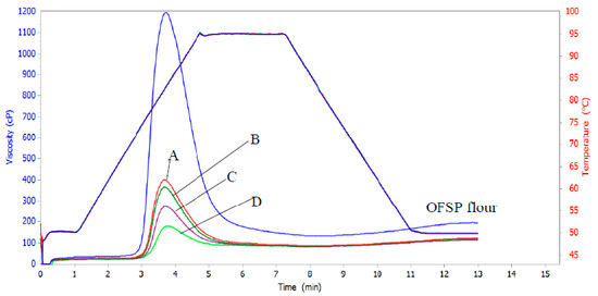 Figure 1 shows the pasting properties of OFSP-based composite flours. The results indicated that OFSP flour recorded the highest peak (1046.5 cP) and final (191.5 cP) viscosities. The peak and final viscosities of the composite flours decreased with increasing levels of substitution of skimmed milk and amaranth leaves powders. The decrease in peak viscosity was from 464.0 to 180.0 cP, while that of final viscosity was from 122.5 to 116.5 cP. The decrease in peak and final viscosities of composite flours compared to OFSP flour is attributed to the high fiber contents of the composites due to addition of amaranth leaves powders. Fiber competes with starch for the limited amount of water available in a food system [49] thus reducing the viscosity. The final viscosity is the change in viscosity after holding cooked starch at 50 °C and it indicates the ability of starch to form a viscous paste or gel after cooking and cooling [43]. The results in Figure 1 indicate that composite flours had lower final and peak viscosities than OFSP flour. This is nutritionally beneficial in infant formulas since a less viscous porridge is a better weaning food for children.