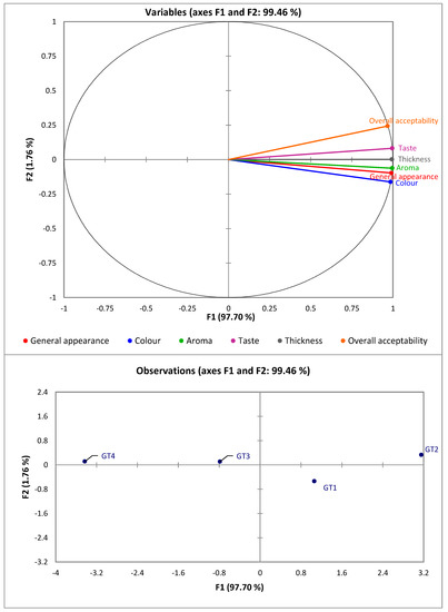 Figure 2 shows the correlation between the sensory attributes of porridges from OFSP-based composite flours. The map shows that the aroma is highly related to general appearance and it is correlated with the first factor (F1). It can also be confirmed that the general appearance, color and aroma are highly correlated with the first axis. It is also observed that all the sensory attributes are spread in the two of the four quadrants. On the other hand, the second factor (F2) is highly correlated with overall acceptability. Sample GT2 has the highest coordinate on the first axis and is highly related to the second factor (Figure 2), which is highly related to taste and overall acceptability. Therefore, sample GT2 was the most highly accepted, likely due to the low levels of amaranth leaves powder. Furthermore, GT1 is in the direction of color and general appearance. Color and general appearance being the most important factors in determining acceptability of the food product would confirm that sample GT1 was most preferred in terms of these two attributes. This is attributed to very low levels of amaranth leaves powder added that might have not imparted a significant change in the color of OFSP flour. In contrast, porridge from samples GT3 and GT4 has the worst ratings. This observation is consistent with what was earlier observed, which is that no sensory attribute was in this quadrant. A zero correlation was observed between thickness and other sensory attributes for all porridges.
