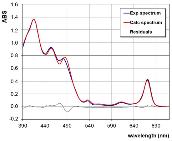 Example of near UV-vis absorption spectrum of an extra-virgin olive oil (EVOO) sample (namely T1), recorded in the range of 390–720 nm. Experimental (blue) and calculated (red) curves are reported with the residuals (black) curve.