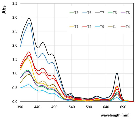 All EVOO and VOO samples were analysed in the bulk by applying the second method (the one proposed by Domenici et al. [17]). Spectral measurements were performed for all samples the same day as the measurements described above by using the first method. For each sample, the amount of pigments is indeed supposed not to change within the same day. The near UV-vis absorption spectra recorded for all investigated samples in the bulk, in the range between 390 nm to 720 nm, as described in Section 2.2, are reported in Figure 2 (here, only one of the three replicates is shown, for each sample). All spectra were scaled in order to have zero absorption (Abs = 0) at wavelengths larger than 720 nm.