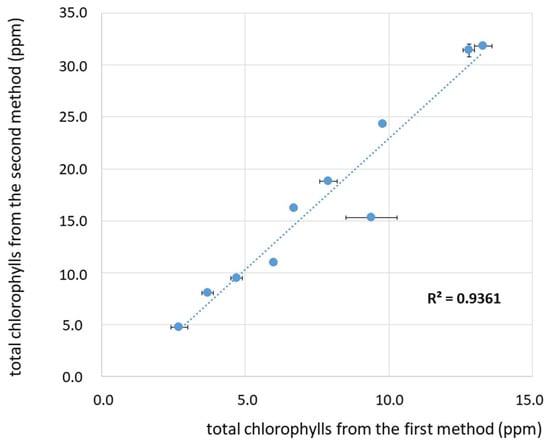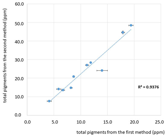 The comparison between the sum of pigments obtained from the first and second methods is shown in Figure 5 and it demonstrates a relatively good linear correlation (R2 = 0.9376). However, as observed for the two pigments’ fractions, the method proposed by Mínguez-Mosquera et al. [11] provides values systematically underestimated by about 40%–60% with respect to the second method proposed by Domenici et al. [17].