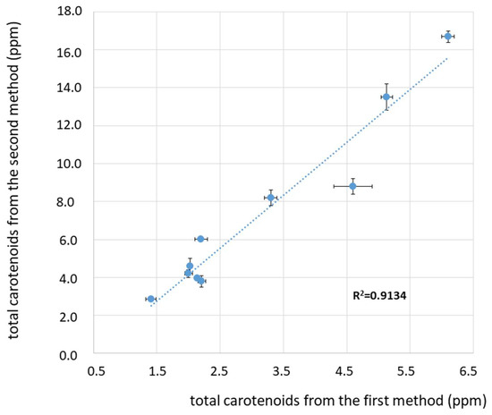 In Figure 4, the comparison between the values of total carotenoids obtained from the first and second methods is reported. In this case, data are much more scattered, and the error (indicated as confidence interval) associated to both methods is larger than for chlorophylls’ derivatives. As reported in a previous study, where the mathematical approach proposed by Domenici et al. [17] was analytically validated with respect to a standard HPLC-DAD protocol [18], the quantification of lutein is less straightforward due to the eventual presence of minor carotenoids having the same absorption spectrum than that of lutein, while β-carotene is quantified with very high precision [18]. This could be one reason for the worse correlation.