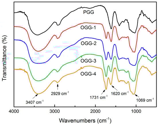 Table 1 showed the carboxyl and carbonyl contents of different OGGs. It showed that the increase in the H2O2 amount resulted in a corresponding increase in the carbonyl and carboxyl contents. The carbonyl content increased from 0.36% to 0.87%, while the carboxyl content increased from 6.11% to 14.51% and the H2O2 increased from 10 to 40 mL. The carbonyl content is much less than the carboxyl content. The same behavior in oat β-glucan was observed by Moura et al. [19], that the carbonyl and carboxyl contents increased with increasing H2O2 level and reaction time. These results suggest that the OGG with different oxidation levels are successfully prepared and the carbonyl and carboxyl content can be adjusted.