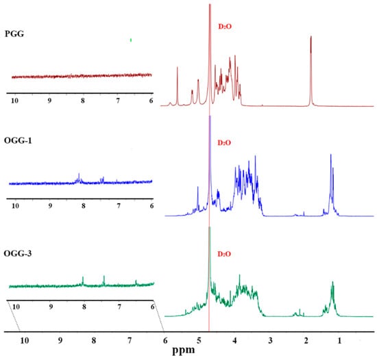 Figure 2. The 1H-NMR spectra of gellan gum (PGG) and oxidized gellan gum (OGG-1 and OGG-3).