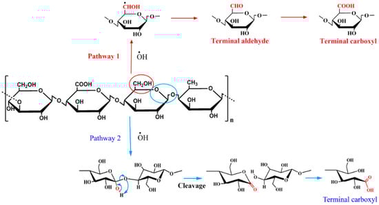 Pathway 1 is proposed via the oxidation of hydroxyl groups such as C6 hydroxyl to carbonyl groups and then to carboxyl groups [26]. As shown in Table 1, the major functional group produced was carboxyl which progressively increased with the H2O2 amount while only little carbonyl groups were formed. The results agreed with earlier studies that the oxidation of polysaccharides favors the formation of carboxyl groups [16,17,28]. It was suggested that once the carbonyl groups were formed, they would be rapidly converted to carboxyl groups [28]. Therefore, only a small amount of carbonyl groups were accumulated as shown in this study. Parallel reaction paths in which carboxyl groups are formed by the oxidation of glycoside bonds as shown in pathway 2 were also reported [29]. As shown in the figure, the attacking of the C1 position in sugar by hydroxyl radicals leads to the cleavage of glycoside bonds of polysaccharides and forms acidic functionality groups. Recently, this pathway was reported as the main molecular mechanism of polysaccharide oxidative cleavage via a Fenton-type reaction in the presence of a copper enzyme [30]. This oxidative cleavage would lead to varied small linear polysaccharides with functional carboxyl groups such as a glucuronic acid group. It is suggested that pathway 2 is dominated in the oxidation process.