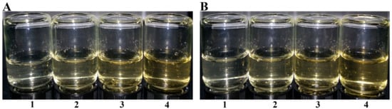 Figure 5. Gel conditions with different OGG-3 content: (A) Ca2+, (B) Na+. The contents are (1) 0.4%, (2) 0.8%, (3) 1.0%, (4) 1.2%.