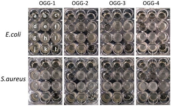 Figure 6. Photographs of bacterial colonies grown in NB (nutrient broth) containing different contents of oxidized gellan gum (OGG): (a) 80 mg/mL, (b) 40 mg/mL, (c) 20 mg/mL, (d) 10 mg/mL, (e) 5 mg/mL, (f) 2.5 mg/mL, (g) 1.25 mg/mL, (h) 0.63 mg/mL, (i) 0.32 mg/mL, (j) 0.16 mg/mL, (k) 0 mg/mL, (l) NB medium.