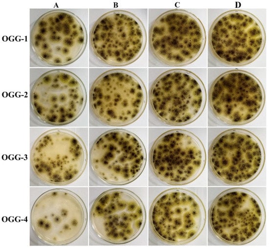 The antifungal activity of the OGG was measured by evaluating the ability to control A. niger growth according to Reference [18]. 1 mL of potato dextrose broth (PDB) containing various contents of the OGG was placed into each well of a 24-well plate. Then 100 μL of A. niger suspension was added to each well. The culture medium was incubated at 28 °C for 24 h. After that, 100 μL of culture medium was collected and reincubated on potato dextrose agar (PDA) plates at 28 °C for 2 days. The appearances of A. niger colonies on PDA plates were observed to evaluate the antifungal activity of the OGG.