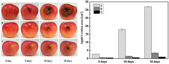 Figure 8. The appearance of apples after treatment by different solutions for different days: (A) 0 mg/mL OGG-4 solution; (B) 10 mg/mL OGG-4 solution; (C) 20 mg/mL OGG-4 solution.