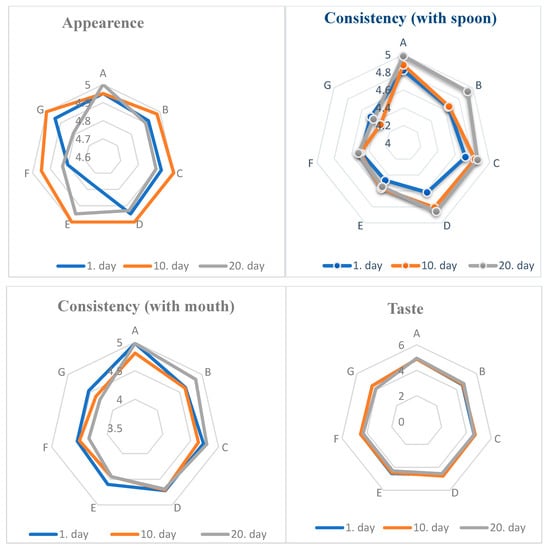 The highest score of taste was yoghurt A without AF, and the lowest score was yoghurt G. While the difference between the flavour properties of yoghurt on the first day of storage was not found to be important, the control yoghurt and the 2% (w/v) AF added yoghurts E, F, and G were found to be significant and considerably different on the 10th and 20th days (p < 0.01). Generally, flavour scores of 1% (w/v) AF added yoghurts were the highest scores after those of yoghurt A. Additionally, 2% (w/v) AF added decreased the scores. During all periods of storage, yoghurt A had the highest total sensory score, and following this, the 1% (w/v) AF added yoghurts on the last day of storage did not change this order. It was determined that the effect of storage time was not significant on the odour, flavour, and total sensory scores of yoghurts (p > 0.05). The difference between the total sensory scores of yoghurts were very significant on the 10th and 20th days of storage (p < 0.05). Yoghurts containing individual cultures were found to have higher scores than those of their mixtures. Fernandez-Garcia and McGregor [23] specified that bamboo, wheat, and inulin fibre added yoghurts had sensory properties close to the control yoghurt. They informed that the sensory and rheological properties of apple fibre added yoghurt were different from those of control yoghurt. Additionally, Staffolo et al. [32] specified that bamboo, wheat, and inulin fibre added yoghurts had sensory properties close to control yoghurt despite apple fibre addition being different significant.