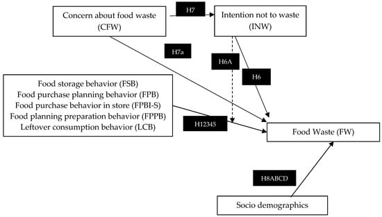 Several studies argue that food decisions are influenced by deep-rooted judgments such as emotions, hunger, values, and habits [34,38]. This leads to a high uncertainty level to characterize consumers’ food choices [39]. These behavioral aspects indicate that the performed behavior can generate a lot of outcomes. Consumers face a set of personal motivations that can(not) be in line with the intention to prevent or reduce food waste. For that reason, food waste-related motivation can cause an intention-behavior gap [40]. The intention-behavior gap is the more general finding that people’s motivations do not accord with their behavior [41]. Furthermore, Setti et al. [39] argue that a gap between food choices and expected consequence (food waste) is a behavior-outcome gap and can further influence consumers’ decision-making. Graham-Rowe et al. [40] conclude that the strength of the intention-behavior relationship is likely to be moderated by whether or not the person actually had control over the behavior. This problem can emerge when other members of the family show behaviors that are not in line with the behaviors of the respondent. Summarizing, several studies argue that an intention to avoid or reduce food waste is significantly related to less food waste [17,40]. According to these studies, higher intention not to waste leads to lower amounts of food waste. Therefore, the following hypotheses are included to find out whether results in the Netherlands correspond with previous research in other countries: