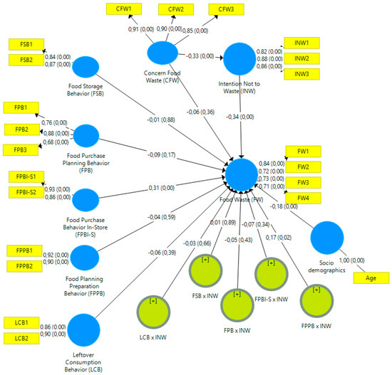 Next, the R2 value of the endogenous construct(s)—constructs explained by the relationships in the model—is to be examined. The R2 value measures the variance, explained in each of the endogenous constructs, and thus the predictive accuracy of the structural model [53]. More specifically, this coefficient of determination indicates the variation in the reported amount of food waste, explained by the independent variables. A higher R2 value means more variability is explained by the structural model. The effect ranges from 0 to 1, with a value of 1 indicating full predictive accuracy. In this study, R2 has a value of 0.38 which—in studies related to consumer behavior—can be described as moderate to substantial explanatory power of the model.