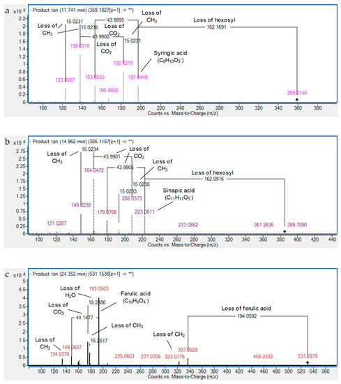 Five isomers of p-coumaric acid hexosides were detected expressing the neutral loss of hexose moieties releasing aglycones of m/z 163.04 followed by decarboxylation (m/z 119.05), except for the hydrated form (M−H+H2O) and, hence, dehydration occurred firstly [13]. In the same manner, three isomers of ferulic acid hexoside (C16H20O9, m/z 355.10) and sinapic acid hexoside (C17H22O10, m/z 385.11) were observed (Table 1 and Table S1). As an example, the fragmentation of the latter compound is shown in Figure 2b. Another compound was described as ferulic acid dihexoside (sibiricose A5). In addition, seven novel hydrocinnamic acids were tentatively identified as ferulic acid pentoside isomers (I–III), sinapic acid deoxyhexoside hexoside isomers (I–III), and diferuloyl hexoside (Table 1 and Table S1). The latter was characterized by the presence of fragment ions at m/z 337.0929 (C16H17O8) and 193.0503 (C10H9O4), i.e., feruloylhexosyl and ferulic acid, respectively. Ferulic acid ion showed the typical decarboxylation and demethylation of this type of compound in MS/MS (Figure 2c), as for sinapic acid. Remarkably, most of these compounds are described for the first time in sesame (Table S1).
