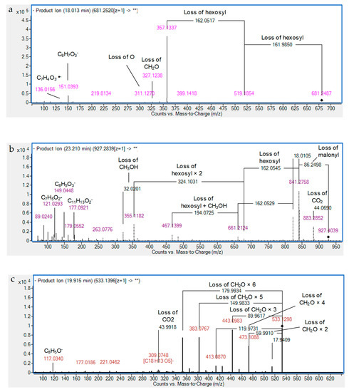 The occurrence of C-glycosides of flavones was noticed with 12 derivatives of either luteolin or apigenin, which were observed for the first time in sesame. They were characterized by the presence of prominent fragment ions after the characteristic sequential loss of 90 (C3H6O3) and/or 120 Da (C4H8O4), in agreement with previous studies [12,14,17,19,27]. As an example, two isomers of luteolin C-hexoside were identified, exerting characteristic fragments at m/z 357.06 and 327.05, respectively. Similarly, three isomers of luteolin C-deoxyhexoside-C-hexoside were tentatively identified based on comparing their fragmentation pattern and UV absorbance with reported literature [27]. As for apigenin derivative, five isomers of apigenin C-pentoside-C-hexoside were observed, showing fragmentation patterns and UV absorbance of C-flavones as described in reported studies [15,17]. Moreover, a minor fragment ion at m/z 117.03 (C8H5O) (1,3B) was observed, suggesting that the aglycone is apigenin. Similarly, two isomers of apigenin di-C-pentoside were tentatively characterized. As Figure 3c shows, the consequent neutral loss of sugar fragments (30–180 Da) was observed (Table 1 and Table S1, Figure 3c).